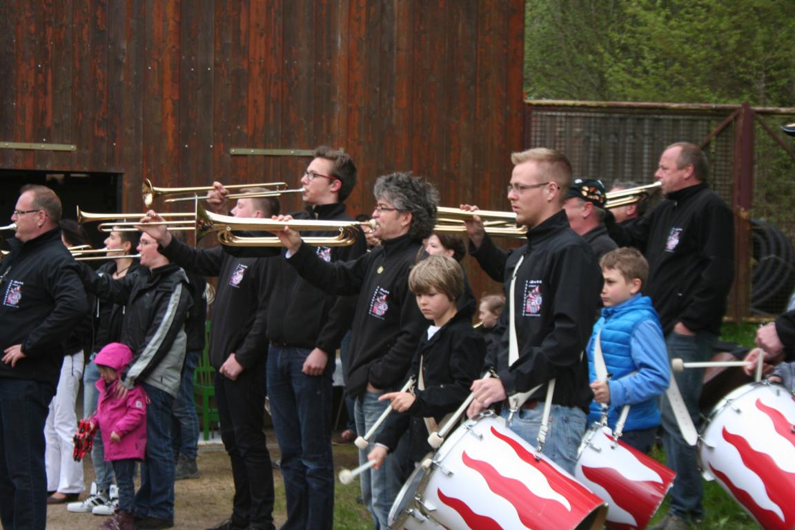 Pünktlich 10 Minuten vor dem Beginn des Maibaumstellens begann das was der Hamburger mit Schietwetter bezeichnen würde. Ein Wetterumschwung der kalten Art mit Regen. Hurtig und in Kurzform begannen wir bei den Grönländern mit dem musikalischen Auftakt des Maibaumstellens. Auch das Stellen des Baumes erfolgte aufgrund des immer schlechter werdenden Wetters im zügigen Tempo. Danach noch der kurze musikalische Abschluss und alle zog es in den warmen und wettergeschützten Wagenschuppen der Seilerburg.